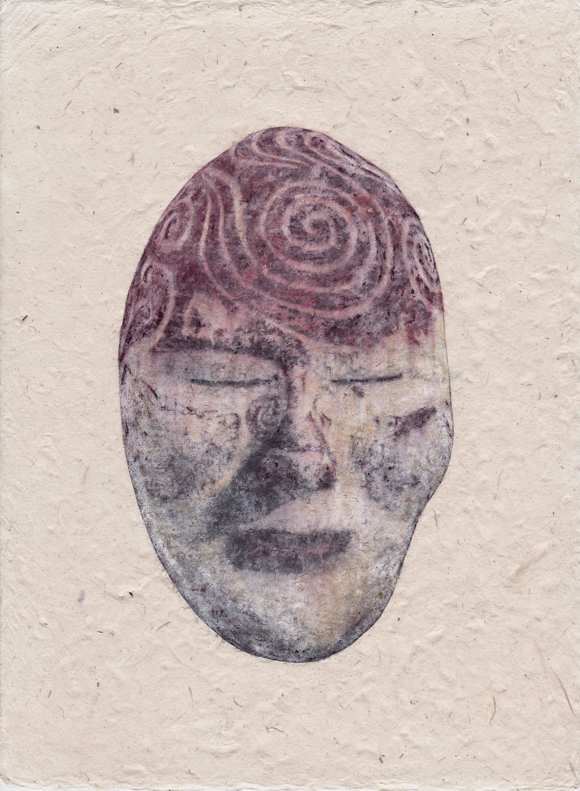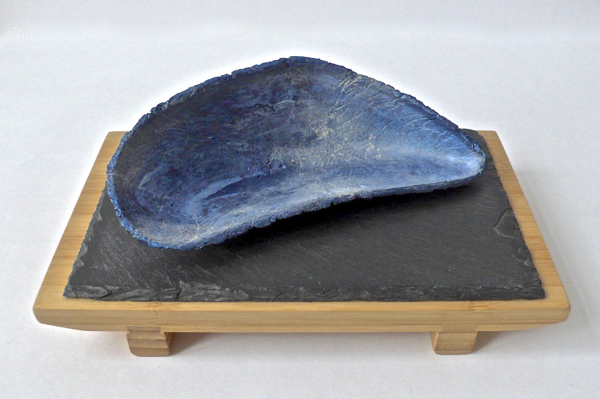 Front of a sculpture on a bamboo table covered with slate, newspaper pulp,